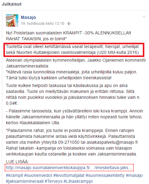 Imeskeltävää Jaksamismineraalia markkinoidaan mielestäni oudolla tavalla. Sitä markkinoivan yrityksen eräässä Facebook-julkaisussa mainitaan esimerkiksi, että ”Tuotetta ovat olleet kehittämässä useat terapeutit, hierojat, urheilijat sekä Nuorten Kultaleijonien ravintovalmentaja (U20 MM-kulta 2016)”.