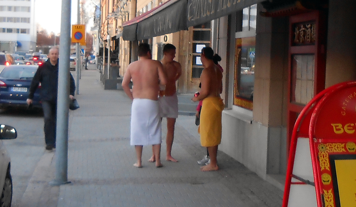 Jotkut hurjimukset olivat tulleet niin kiirellä torille, että olivat unohtaneet laittaa saunan jälkeen vaatteet päälle: